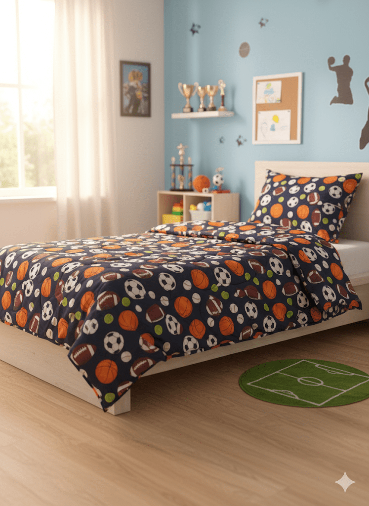 10-71-02-0064 - FRAZADA LIGERA, Cobertor de material microfibra de poliester con acabado interior tipo borrega, TAMAÑO KING SIZE - ALTURA 210 - 220 CM, ANCHO 230 - 240 CM, DISEÑO INFANTIL BALONES DEPORTIVO